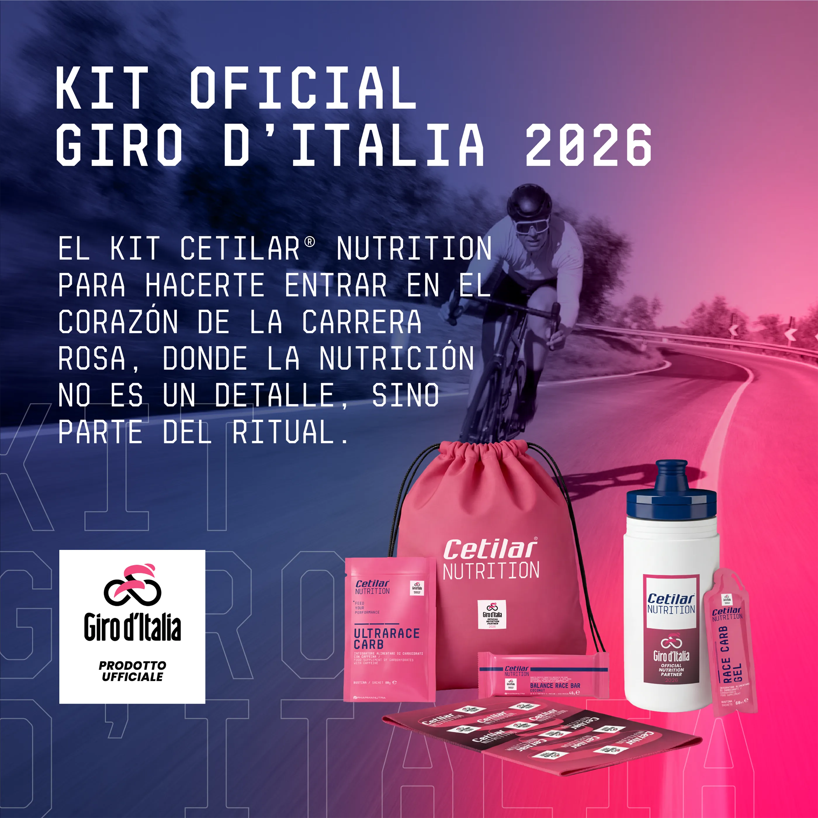 El Kit Cetilar® Nutrition es una invitación a vivir la espera, el gesto, la preparación: lleva un fragmento del Giro d’Italia a tus salidas, a tus entrenamientos, a tu rutina deportiva. Elígelo y vive la carrera como protagonista.